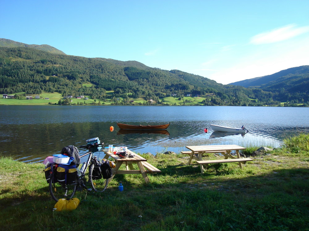 A Svene, piccolo centro abitato, decido di fare la seconda colazione. C’è anche un distributore, un meccanico, un ufficio postale, il comune. In Norvegia se c’è un distributore di benzina , a fianco c'è pure un piccolo market con annesso reparto hot -dog e hamburger. Conforta ogni tanto azzannarne uno. Mi affascina il paesaggio montano, che alla nostre latitudini si incontra sopra i 1200 metri. Stanco e affamato decido, alle 13,00 di fermarmi dentro un casotto in legno di una fermata del bus. “ Adesso mi sbrano una scatoletta di fagioli alla messicana con aggiunta di olio piccante, pane finto, cioè quello nelle buste a lunga conservazione, un po’ di frutta secca e acqua quanto basta; mi faccio un the caldo mi riposo finchè non smette di piovere”. L' i-pod, è il mio doping musicale e la strada mi sembra più agevole. Smette anche di piovere, e affronto un lungo rettilineo fra campi di luppolo. All’inizio di ogni strada dove vi sono abitazioni ci sono le cassette delle lettere, un po’ come da noi nei portoni.